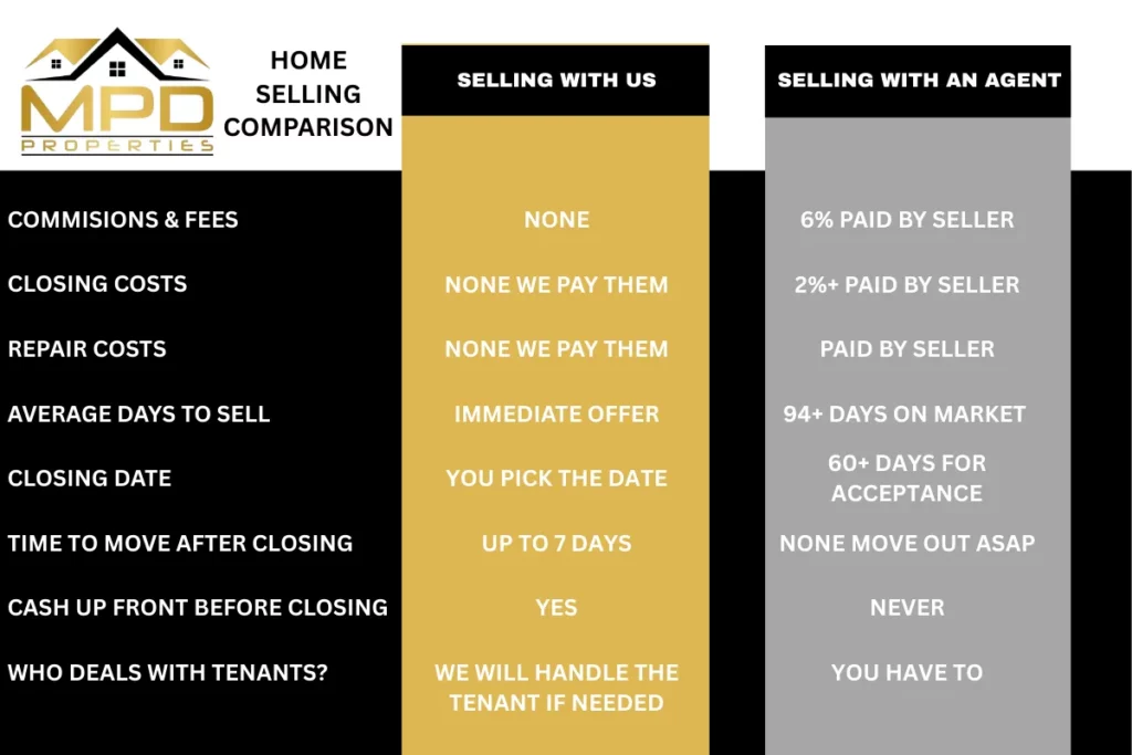 MPD HOME BUYERS provides the fastest option for selling your Livingston home. No listing fees, agent commissions, and a quick and hassle-free closing process. When you sell to companies that buy houses, you skip the hassle of repairs and agents. Getting rid of the headache and hassle of dealing with an unwanted property is our service to you. See the side-by-side comparison below: